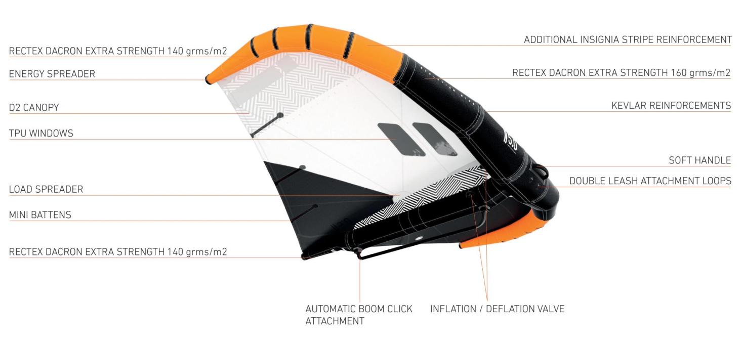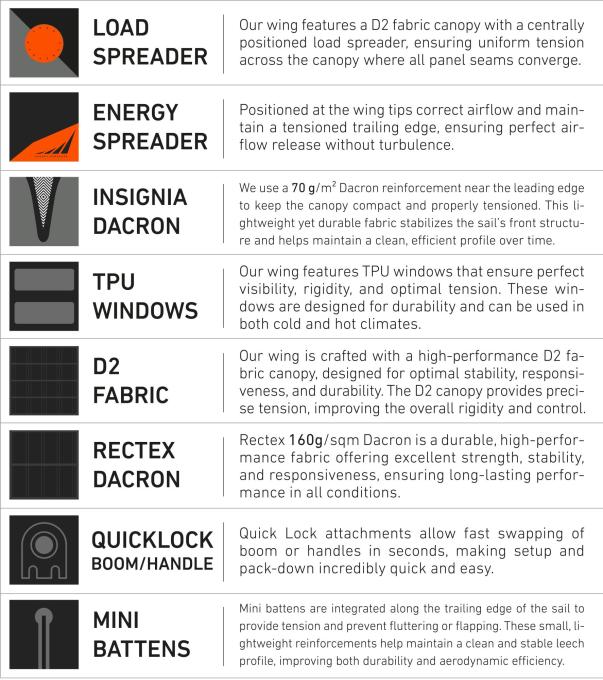Новое крыло Evolution Wing разработано для обеспечения плавной тяги, лёгкого управления и стабильной производительности в любых условиях, что делает его идеальным для райдеров любого уровня. Рама из дакрона Rectex 160 г/м² плотностью обеспечивает прочную конструкцию и отличную прочность, сохраняя отзывчивость даже при порывистом ветре. Внутренняя кайма полоса Insignia 70 г/м² плотностью усиливает переднюю кромку, обеспечивая дополнительную жёсткость. Уменьшенный диаметр баллонов и передней кромки минимизирует сопротивление воздуха, повышая эффективность и обеспечивая более плавное и стабильное катание, особенно при вырезании на ветер . Улучшенное натяжение купола, центральный распределитель нагрузки и оптимизированная динамика скручивания улучшают контроль и минимизируют турбулентность, обеспечивая плавный и реактивный ход.